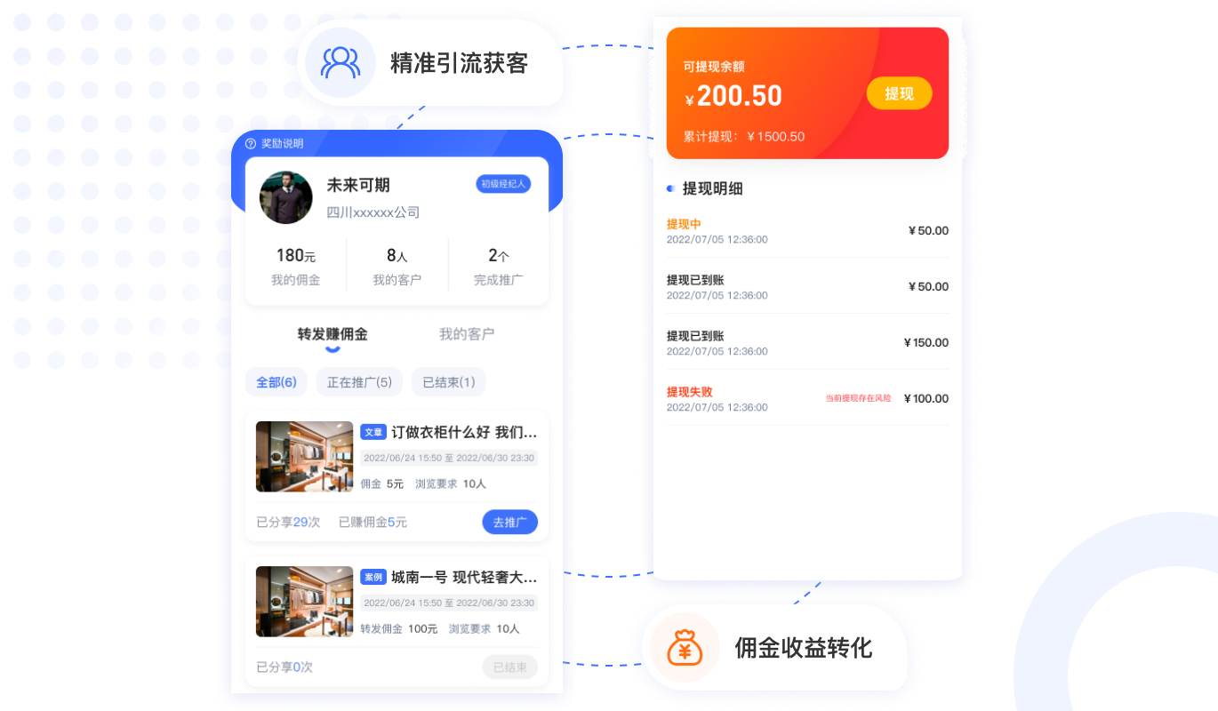 精準(zhǔn)引流,客戶軌跡追蹤推送、深度洞察客戶需求。 快速鎖客,直接對話消息及時提醒,增加量房量為銷售賦能。